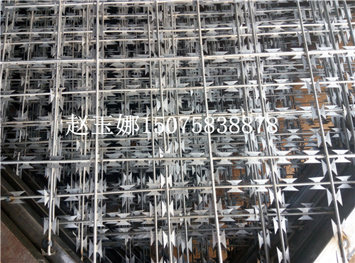 刀刺隔離網墻工藝:它采用鋼板(刀板)沖壓成型包附于熱鍍鋅鋼絲(芯線)之上,由銳利尖角鍍鋅鋼板或不銹鋼薄板做刀片,高張力鋼絲做芯線組合而成的。