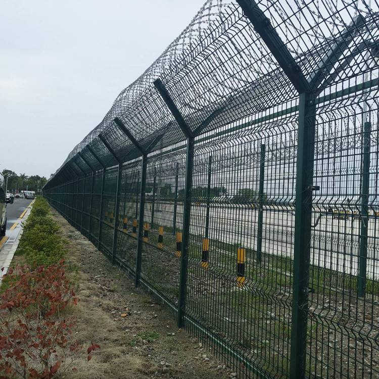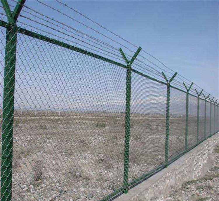 機場護(hù)欄網(wǎng)又稱作“Y型安全防御護(hù)網(wǎng)”,由Y型支架立拄,加強型焊接網(wǎng),安全防盜連接件和熱鍍鋅刀片刺網(wǎng)組成,是強度和安全防御性級別很高的圍界護(hù)欄網(wǎng)產(chǎn)品。采用5.0mm高強度低碳鋼絲焊接,網(wǎng)孔:50mmX100mm,50mmX200mm網(wǎng)片中帶有V型加強筋,可大大增強圍網(wǎng)的抗沖擊力,立柱為60X60的矩形鋼,頂端焊有V型之架,或者采用70mmX100mm的掛式。注:如果在機場護(hù)欄網(wǎng)頂部加裝刀片刺絲、刀片刺繩后又很好的增強了安全防護(hù)性能。