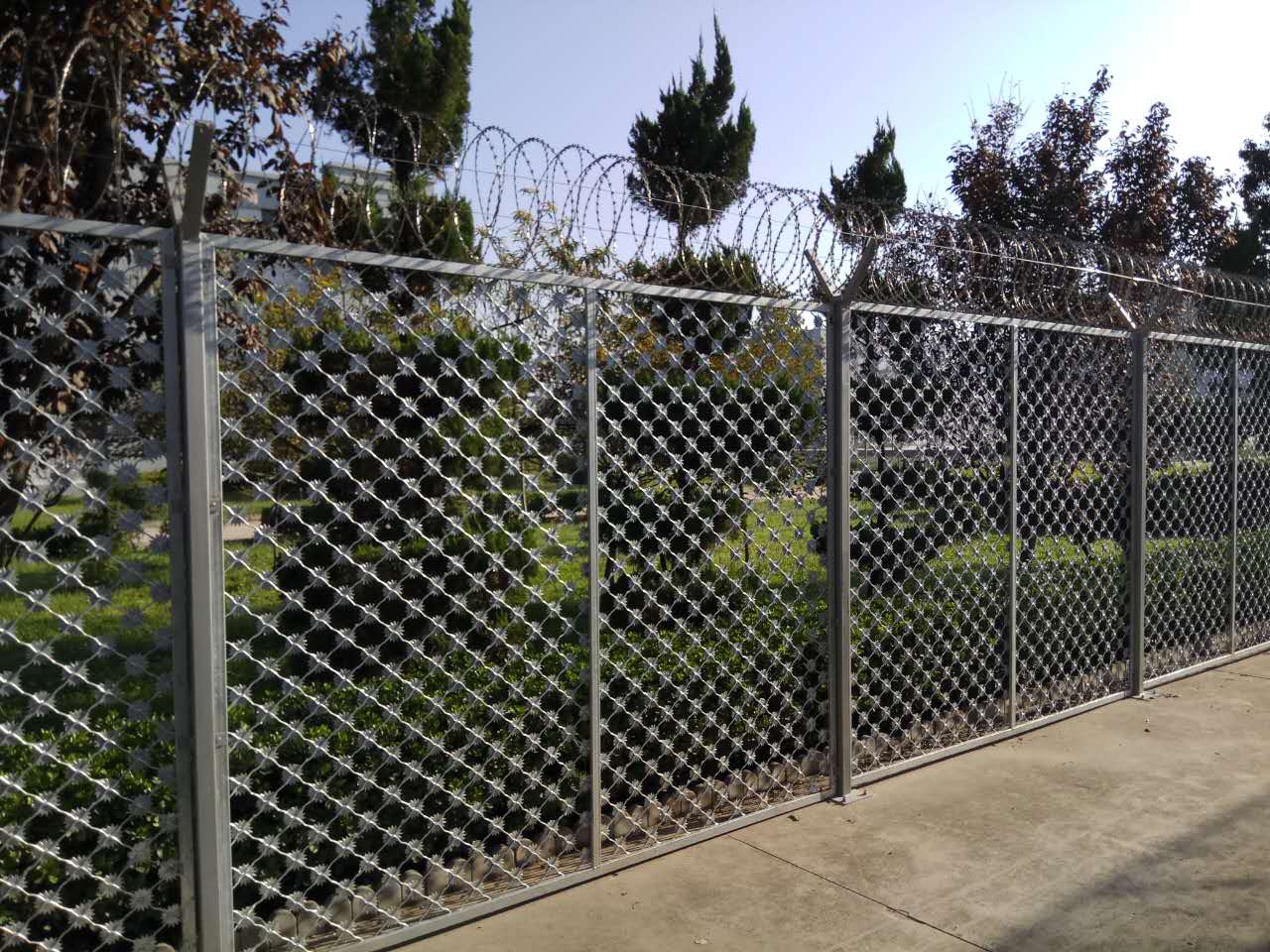 監(jiān)獄鋼網(wǎng)墻所采用的生產(chǎn)FHB/Q1268焊接標(biāo)準(zhǔn)生產(chǎn),以低碳鋼絲,鋁鎂合金編織焊接生產(chǎn), 用于公路,鐵路,飛機(jī)場(chǎng),住宅小區(qū),港口碼頭,花園,飼養(yǎng),畜牧等的圍欄防護(hù)。整體浸塑處理,防盜螺栓連接。
